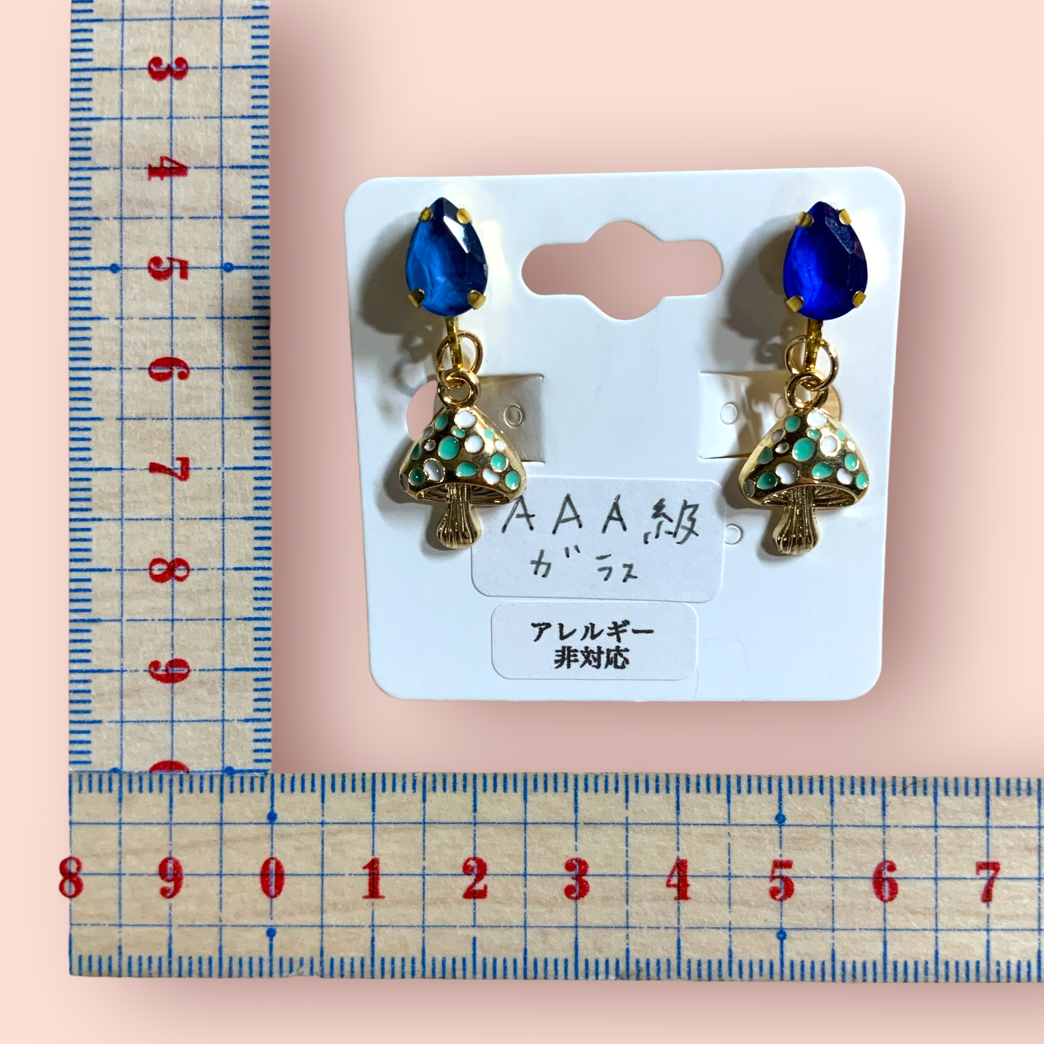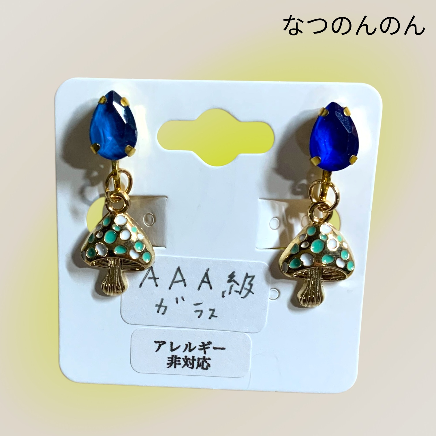 イヤリング グリーンきのこ×AAAガラスブルーアシメ