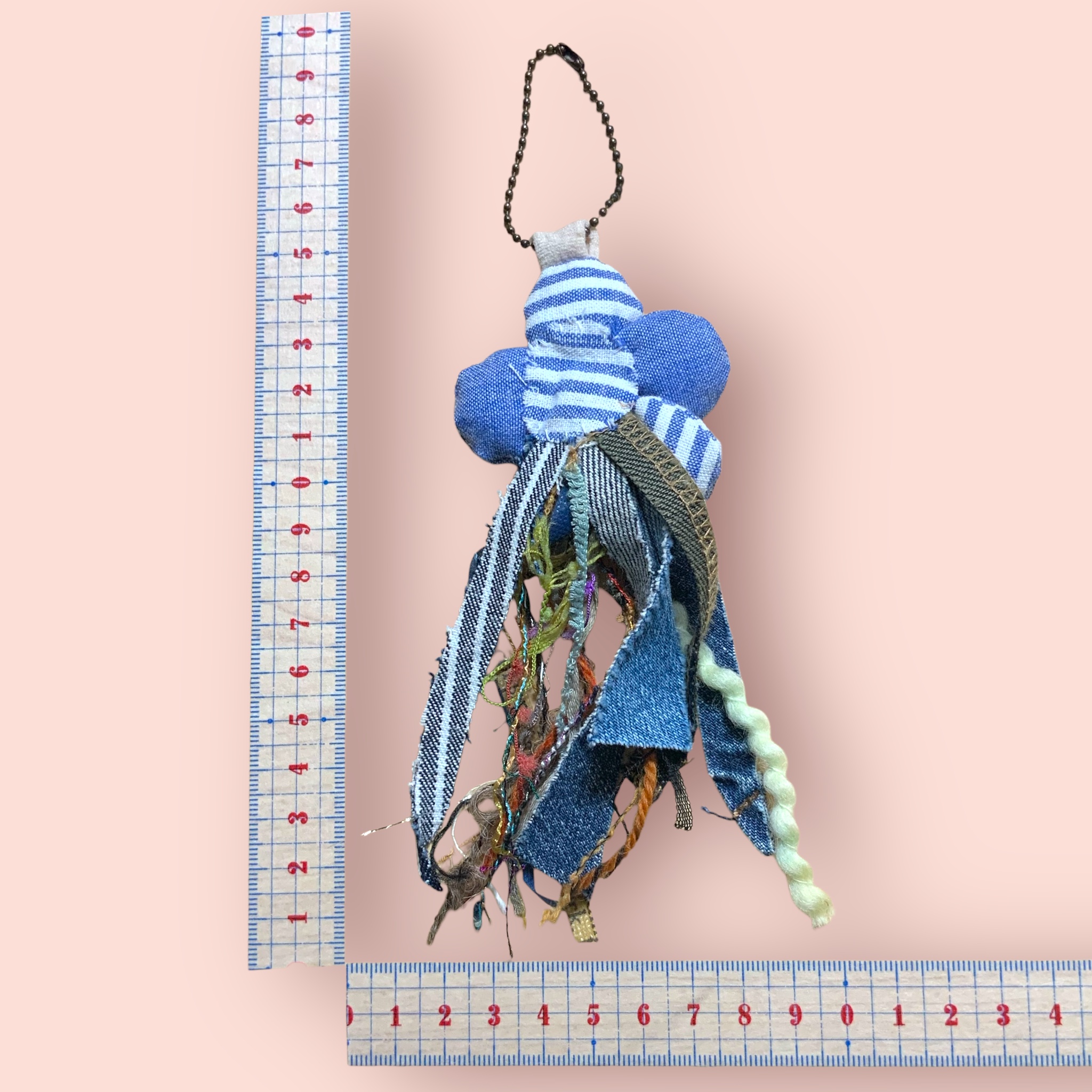 キーホルダー ブルー×しましまお花 デニム×引き揃え糸 ウッドボタン