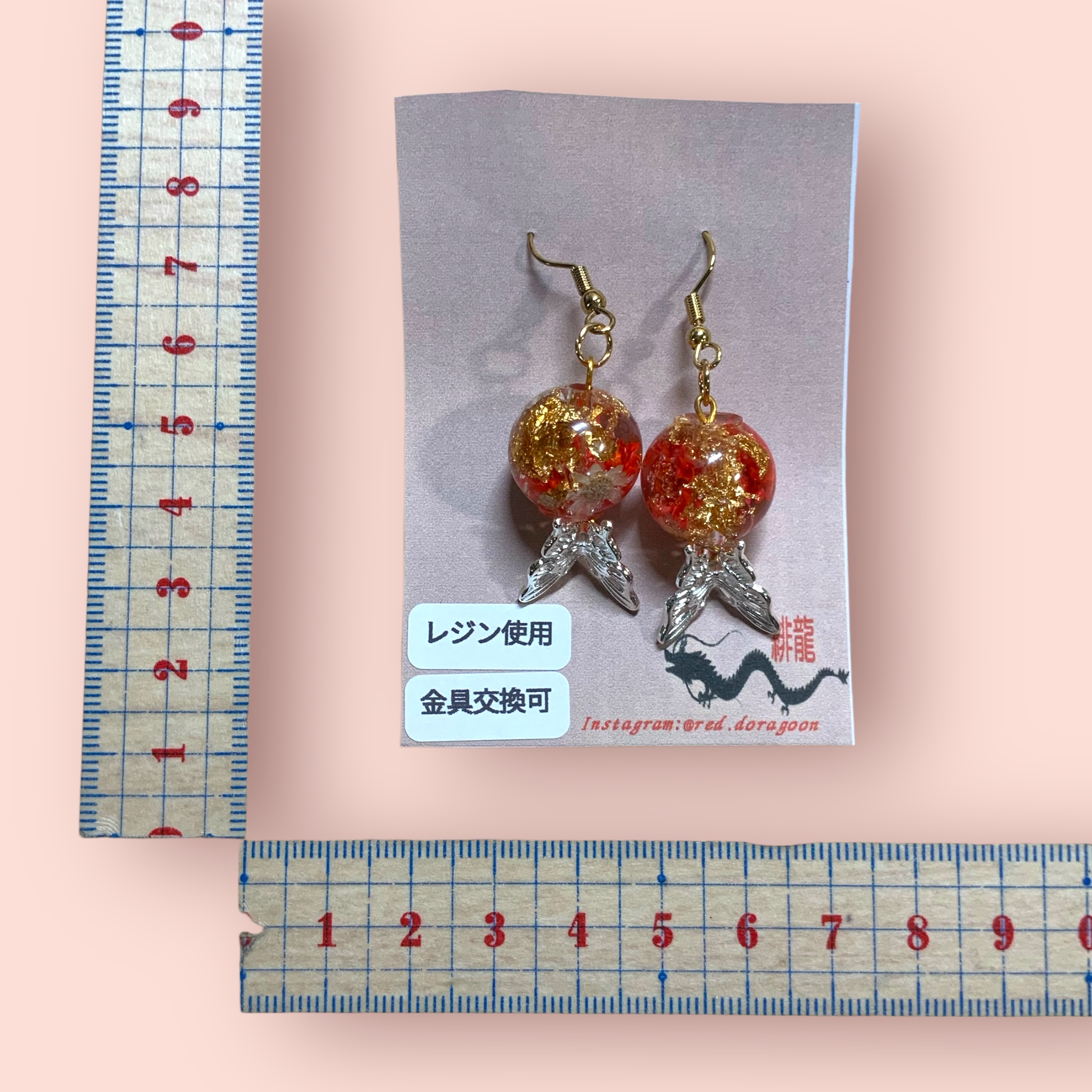 イヤリング  赤系大きめレジンビーズ×蝶々