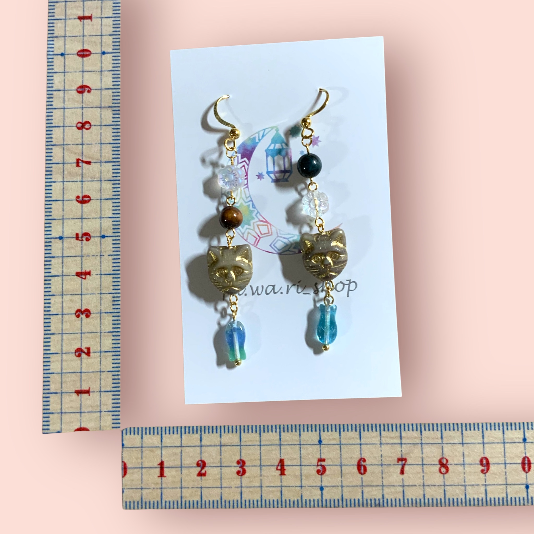 ピアス   タイガーアイ×チェコビーズ  お魚くわえたネコ