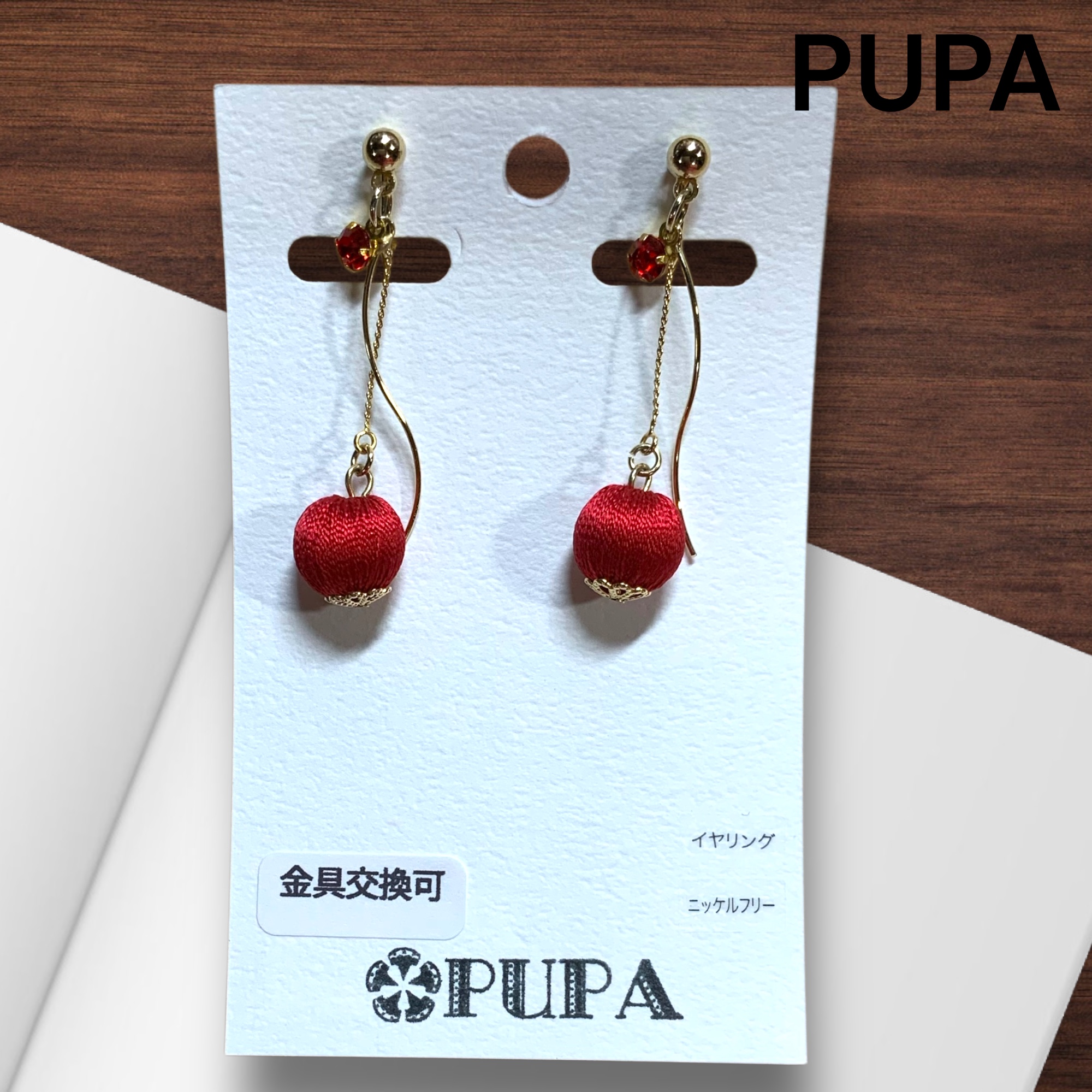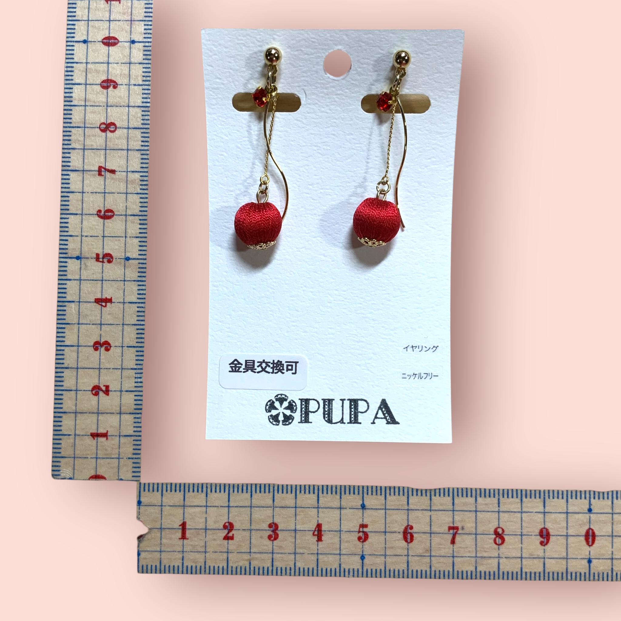 イヤリング 巻き玉 赤ロング 赤色×赤ラインストーン